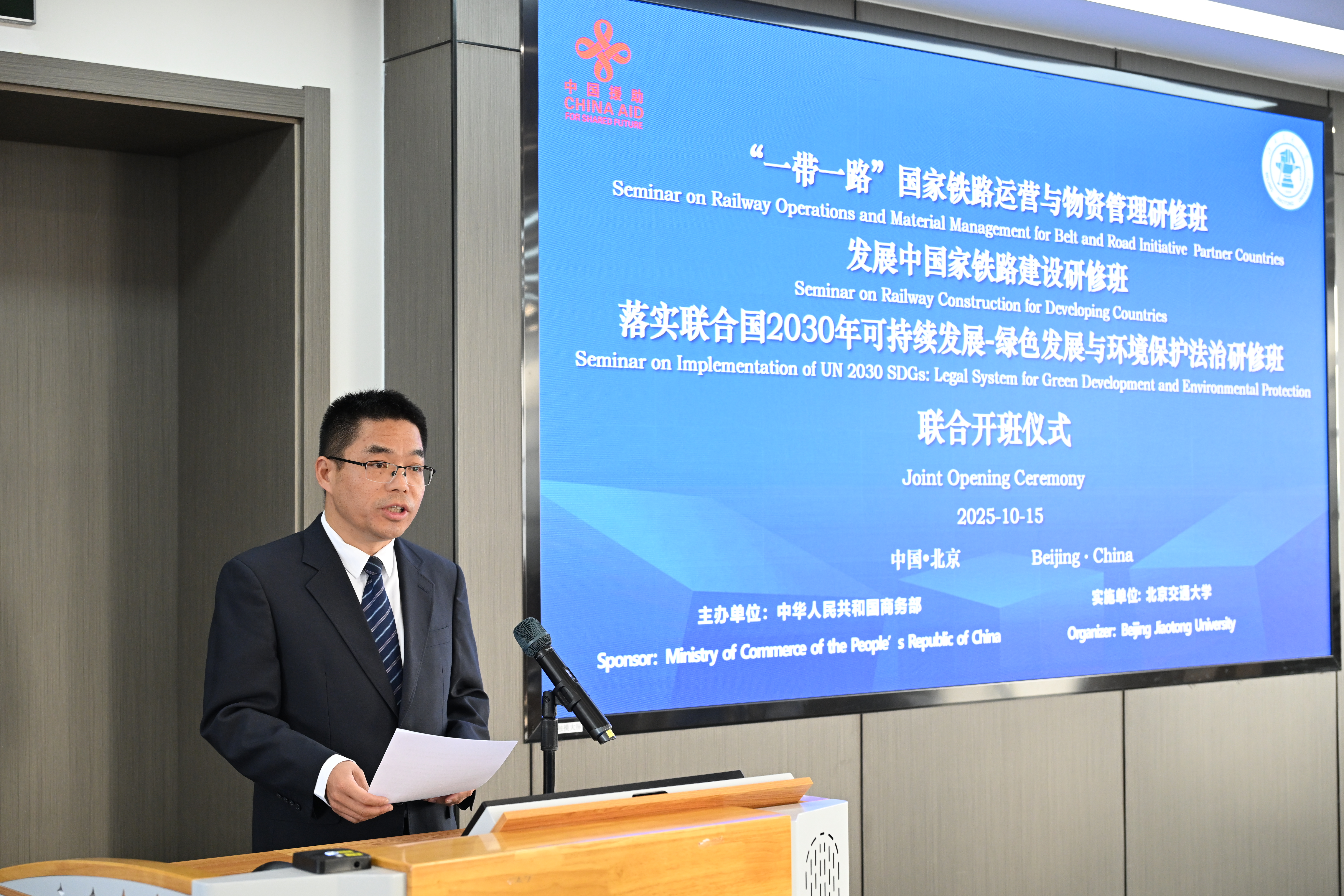 10月15日下午,我校举办援外短期培训项目“一带一路”国家铁路运营与物资管理研修班、发展中国家铁路建设研修班、落实联合国2030年可持续发展—绿色发展与环境保护法治研修班联合开班仪式。副校长艾渤、国家铁路局综合司(外事司)国际合作办公室主任于涛出席并致欢迎辞。