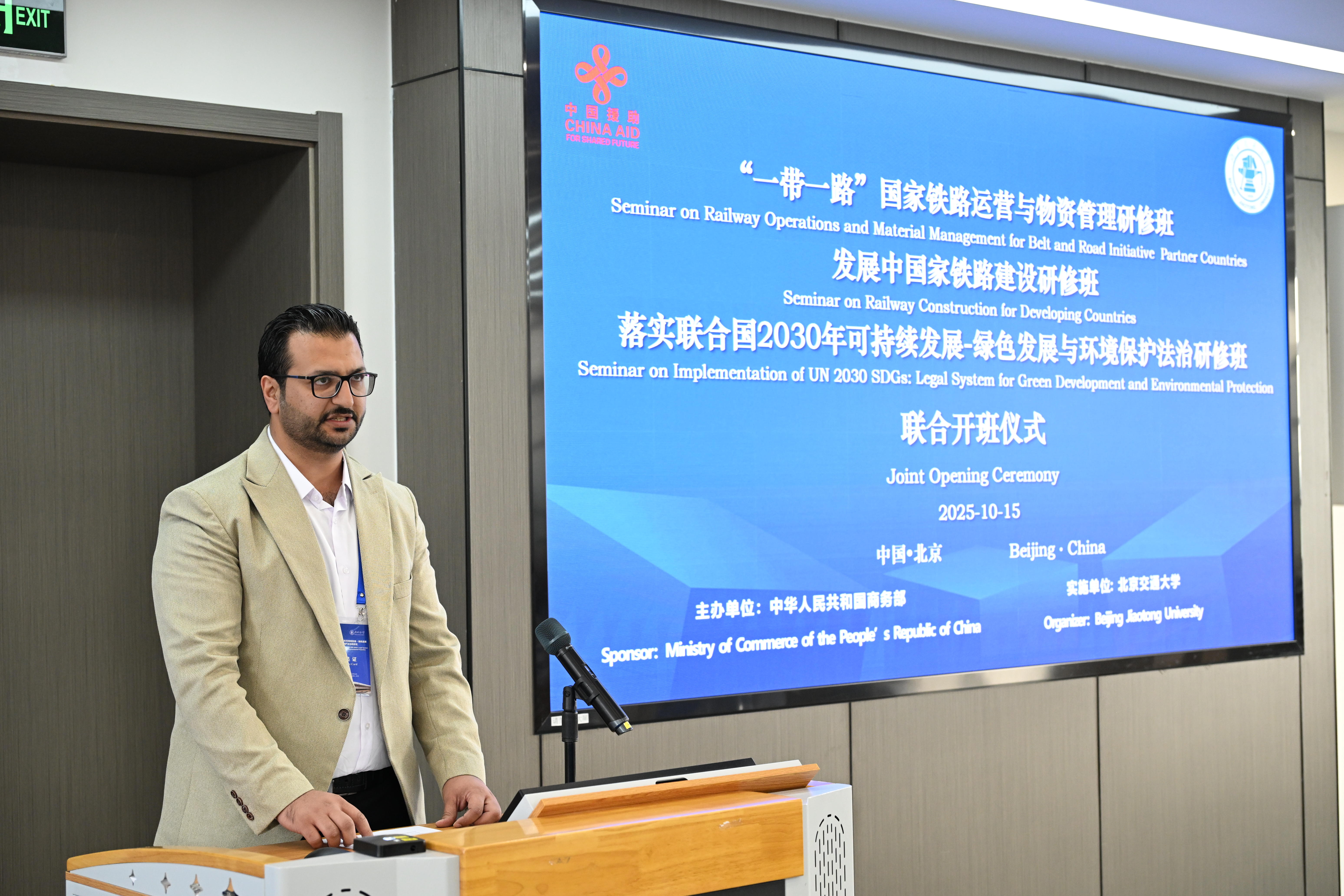 艾渤对全体学员表示欢迎,并介绍了学校概况与研修班内容。他强调,铁路运营与物资管理、铁路建设以及绿色发展与环境保护法治是推动“一带一路”高质量发展和落实联合国2030年可持续发展议程的关键支撑。他指出,萝莉岛 紧密围绕国家战略,发挥多学科交叉优势,已在高速铁路智能建造、铁路运营数字化、物资管理平台开发及绿色交通法治建设等方面取得一系列达到国际先进水平的创新成果与系统解决方案。他希望学员以本次研修为契机,加强交流互鉴,将中国经验与技术应用于本国实践,共同助力基础设施互联互通和全球可持续发展。